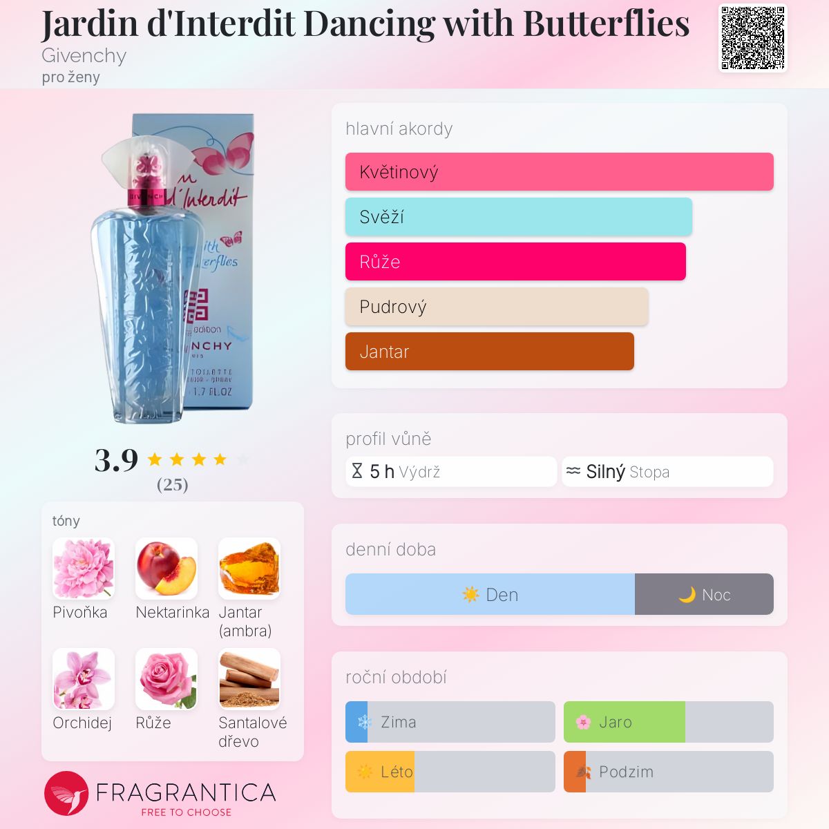 Jardin d'Interdit Dancing with Butterflies podle Givenchy je Floral vůně pro ženy. Jardin d'Interdit Dancing with Butterflies byl/a uveden/a v roce 2008. Vrchní tón je Nektarinka ; střední tóny jsouPivoňka a Růže ; základní tóny jsou Jantar (ambra), Orchidej a Santalové dřevo.