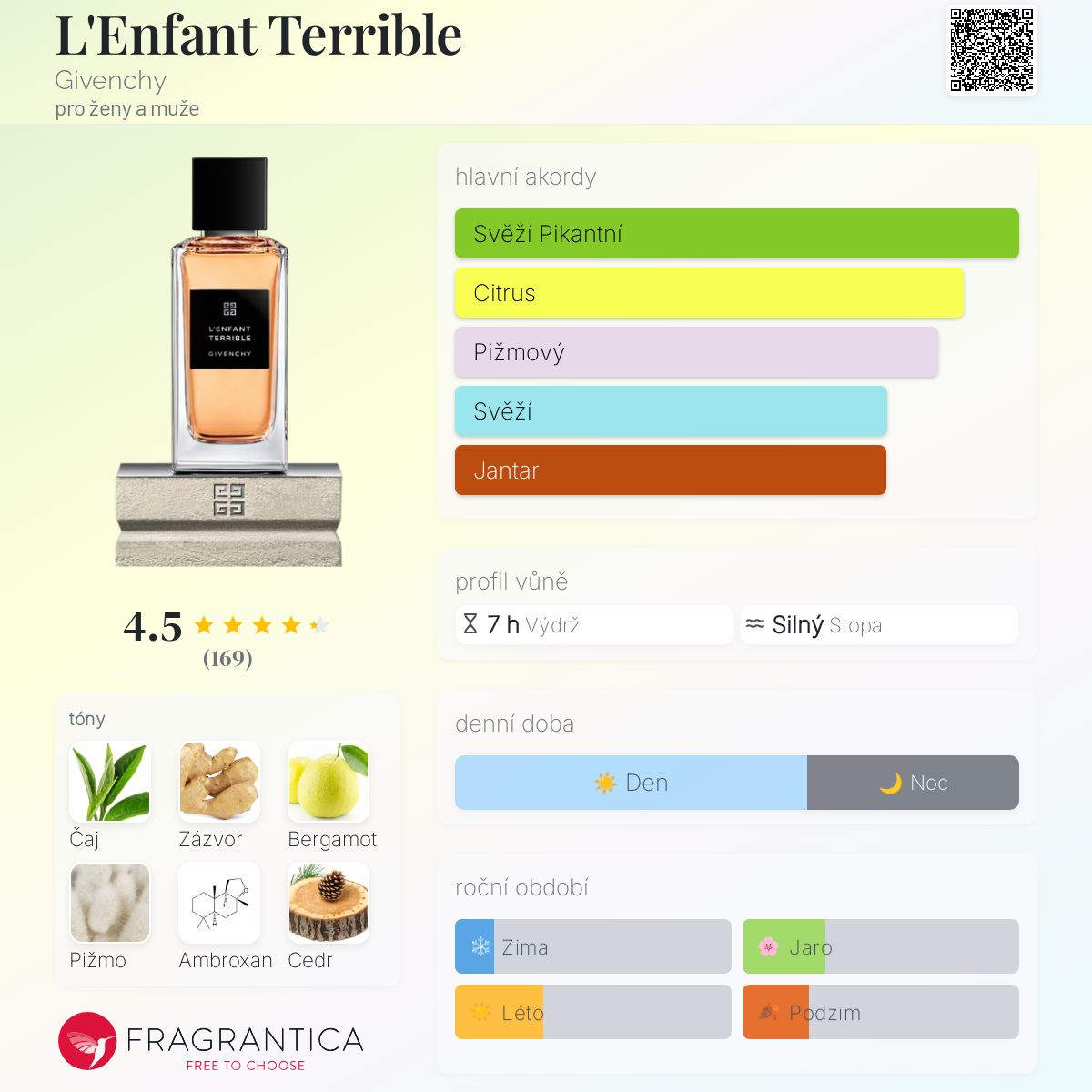 L'Enfant Terrible podle Givenchy je Citrus Aromatic vůně pro ženy a muže. Toto je nová vůně. L'Enfant Terrible byl/a uveden/a v roce 2025. Vrchní tón je Bergamot ; střední tóny jsouČerný čaj a Zázvor ; základní tóny jsou Pižmo, Ambroxan, Cedr a Labdanum.