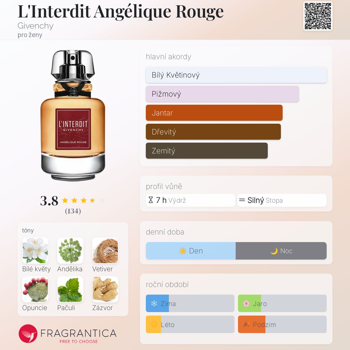 L'Interdit Angélique Rouge podle Givenchy je Orientální Woody vůně pro ženy. Toto je nová vůně. L'Interdit Angélique Rouge byl/a uveden/a v roce 2025. "Nosem" za touto vůní je Takasago. Vrchní tóny jsou Andělika, Opuncie a Zázvor; střední tóny jsouBílé květy a Andělika ; základní tóny jsou Haitský vetiver a Pačuli.