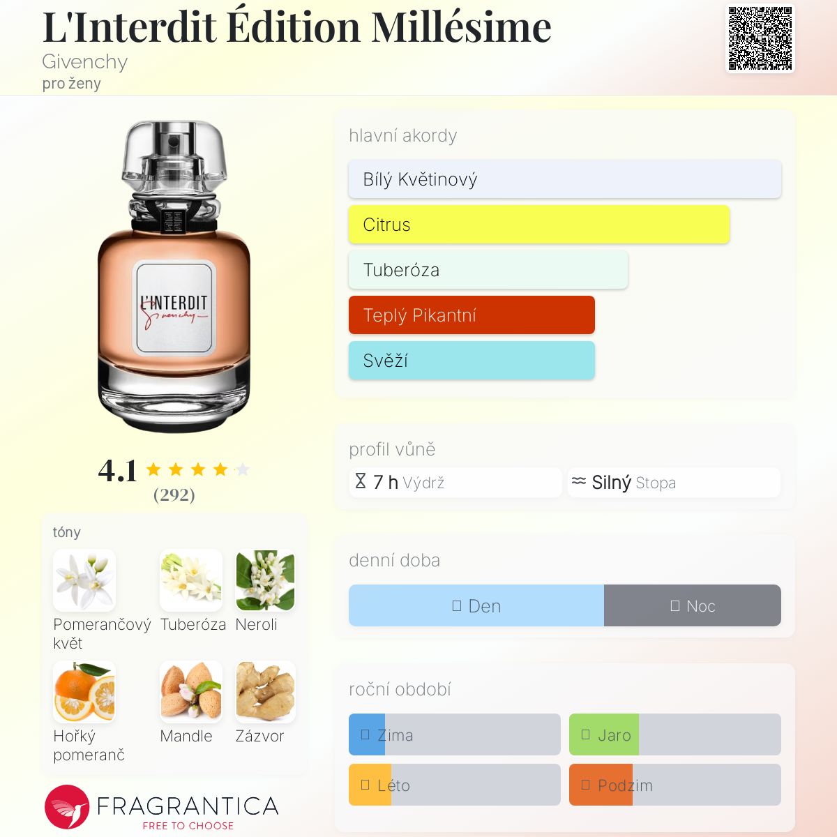 L'Interdit Édition Millésime podle Givenchy je Orientální Floral vůně pro ženy. L'Interdit Édition Millésime byl/a uveden/a v roce 2021. L'Interdit Édition Millésime byl/a vytvořen/a Anne Flipo, Dominique Ropion a Fanny Bal. Vrchní tóny jsou Hořký pomeranč a Zázvor; střední tóny jsouPomerančový květ, Tuberóza a Neroli ; základní tóny jsou Mandlové mléko, Vetiver, Pižmo a Pačuli.