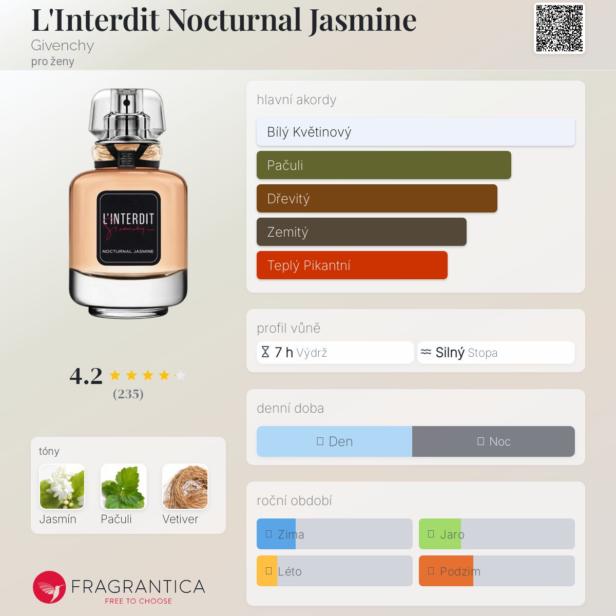 L'Interdit Nocturnal Jasmine podle Givenchy je Chypre Floral vůně pro ženy. L'Interdit Nocturnal Jasmine byl/a uveden/a v roce 2022. Vrchní tón je Indický jasmín ; střední tón jeVetiver ; základní tón je Pačuli.