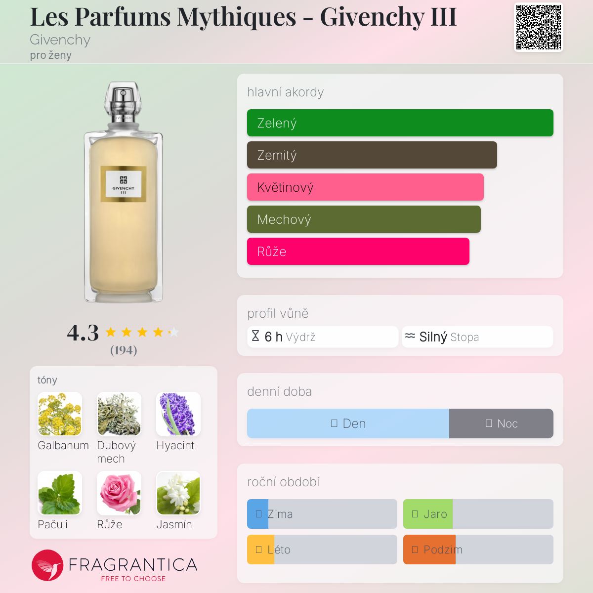 Les Parfums Mythiques - Givenchy III podle Givenchy je Chypre Floral vůně pro ženy. Les Parfums Mythiques - Givenchy III byl/a uveden/a v roce 2007. Vrchní tóny jsou Galbanum a Hyacint; střední tóny jsouRůže a Jasmín ; základní tóny jsou Dubový mech a Pačuli.