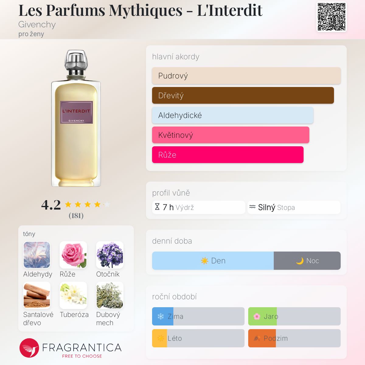 Les Parfums Mythiques - L'Interdit podle Givenchy je Floral Aldehyde vůně pro ženy. Les Parfums Mythiques - L'Interdit byl/a uveden/a v roce 2007. Vrchní tóny jsou Aldehydy, Růže, Fialkový list, Broskev, Pivoňka a Vonokvětka; střední tóny jsouRůže, Otočník, Tuberóza, Pomerančový květ a Švestka ; základní tóny jsou Santalové dřevo, Dubový mech, Jantar (ambra), Pižmo, Cedr a Pačuli.