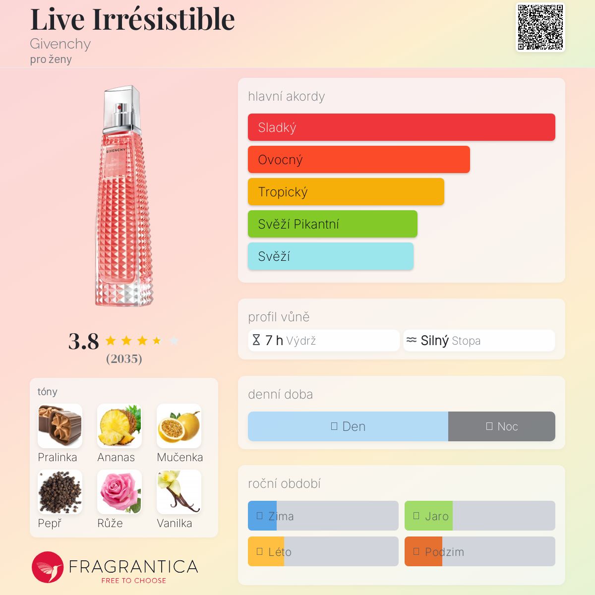 Live Irrésistible podle Givenchy je Floral Fruity vůně pro ženy. Live Irrésistible byl/a uveden/a v roce 2015. "Nosem" za touto vůní je Dominique Ropion. Vrchní tóny jsou Ananas, Okvětní lístky růží, Mandarinka a Grapefruit; střední tóny jsouMučenka, Pepř a Růže ; základní tóny jsou Pralinka, Vanilka, Pačuli, Jantar (ambra), Pižmo a Orris.