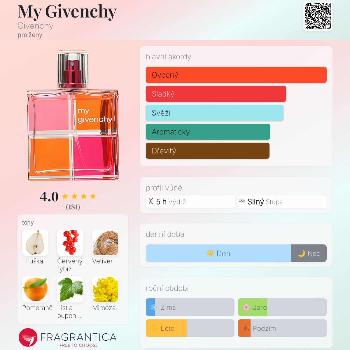 My Givenchy podle Givenchy je Floral Fruity vůně pro ženy. My Givenchy byl/a uveden/a v roce 2005. "Nosem" za touto vůní je Evelyne Boulanger. Vrchní tóny jsou Hruška, Červený rybíz, Pomeranč a Kasie; střední tóny jsouMimóza, Konvalinka a Fialka ; základní tóny jsou Vetiver, Bílé pižmo a Pačuli.