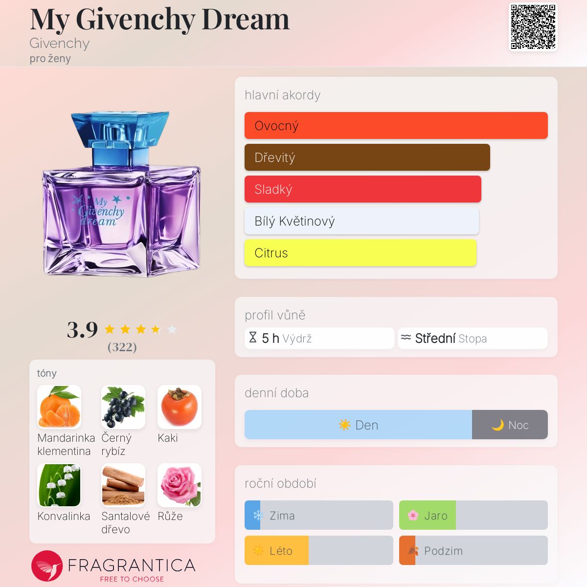 My Givenchy Dream podle Givenchy je Floral Fruity vůně pro ženy. My Givenchy Dream byl/a uveden/a v roce 2008. "Nosem" za touto vůní je Mark Buxton. Vrchní tóny jsou Mandarinka klementina, Černý rybíz a Kaki; střední tóny jsouKonvalinka, Růže a Jasmín ; základní tóny jsou Santalové dřevo, Pačuli a Jantar (ambra).