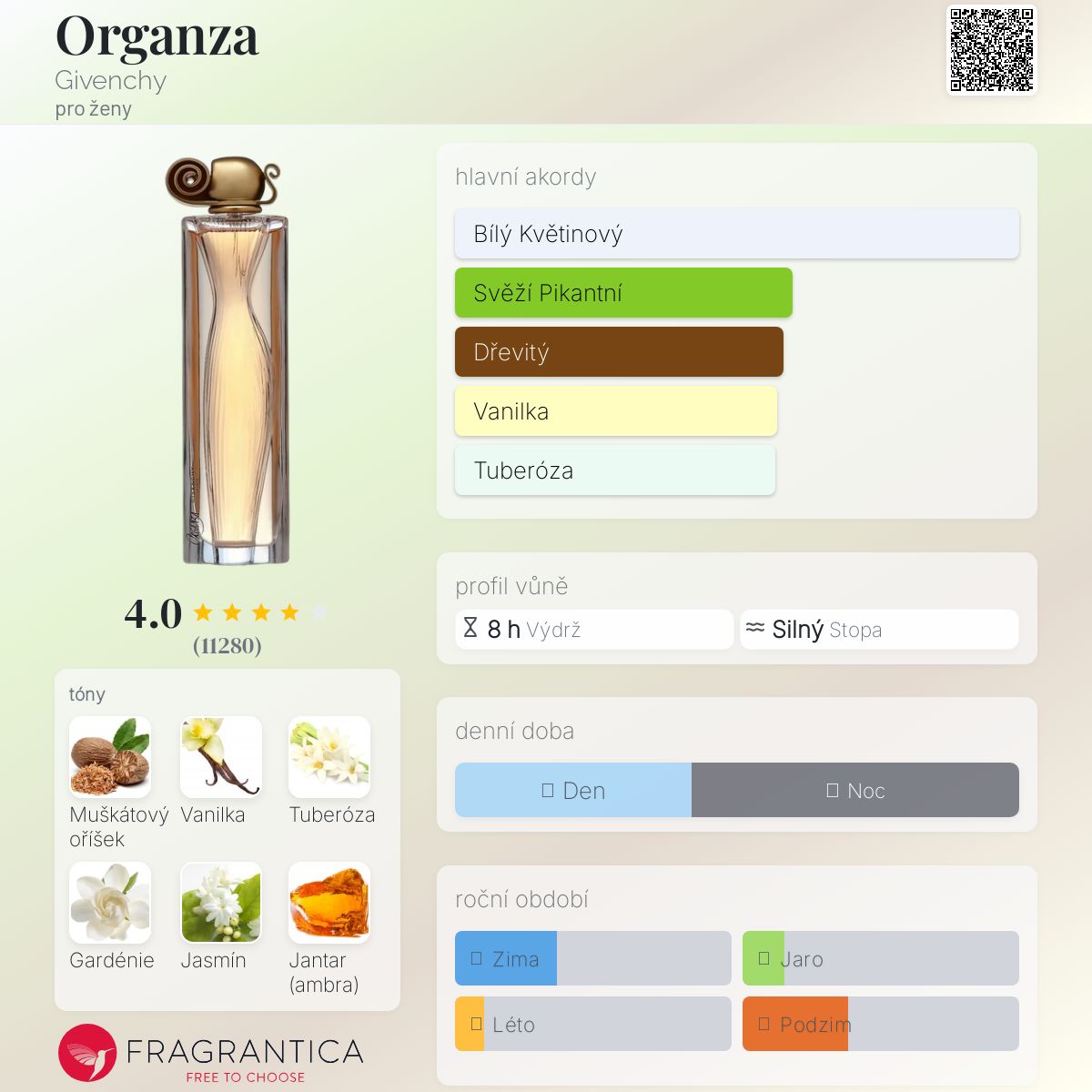 To je rozdíl mezi parfémem 'klasickým' a hodně pro současné vanilkově ovocné květinové. Spousta současných VFF (Vanilla Fruity Florals) nevoní špatně, ale chybí protipól sladkosti, který by vše vyvážil. Takže tyto VFF zůstávají lineární a na povrchu. Snadno se vám omrzí, protože mezi jednotlivými tóny a úrovněmi není "napětí". Protože v nich nejsou zabudované kontrasty, háčky a malá čichová překvapení. Jsou to poníky typu "jeden dominantní nebo dva dominantní triky". Například v "Organza" je sladká květinová síla držena na uzdě muškátovým oříškem ve vrchní části a svěžestí bergamotu a zelenými tóny a cedrem a vlašským ořechem a guajakovým dřevem A.... A... A... Organza je kousek de résistance, který vyvažuje květinovou sílu a dřevitou sílu kořením, svěžími tóny a tajnou zbraní v podobě vlašského ořechu. Samozřejmě je to Givenchy, takže technicky je tato vůně prvotřídní. Skvělá vůně, vynikající dlouhověkost, dokonale namíchaná, mistrovsky vyvážená "do puntíku".