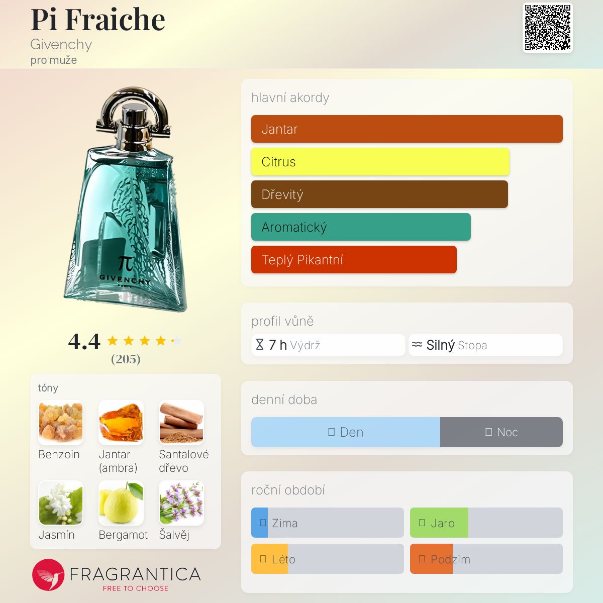 Pi Fraiche podle Givenchy je Woody Aromatic vůně pro muže. Pi Fraiche byl/a uveden/a v roce 2001. "Nosem" za touto vůní je Alberto Morillas. Vrchní tóny jsou Bergamot, Šalvěj, Grapefruit, Citrón a Mandarinka; střední tóny jsouJasmín, Jehličí borovice a Dřevité tóny ; základní tóny jsou Benzoin, Jantar (ambra) a Santalové dřevo.