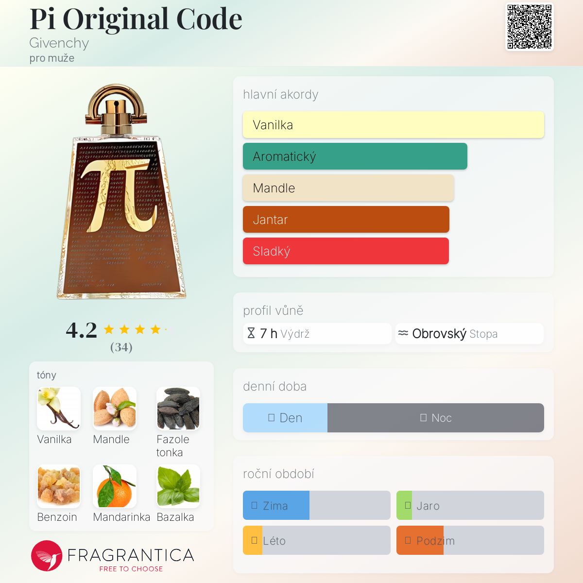 Pi Original Code podle Givenchy je Orientální Woody vůně pro muže. Pi Original Code byl/a uveden/a v roce 2006. "Nosem" za touto vůní je Alberto Morillas. Vrchní tóny jsou Mandarinka, Bazalka, Rozmarýn a Estragon; základní tóny jsou Vanilka, Mandle, Fazole tonka, Benzoin a Cedr.