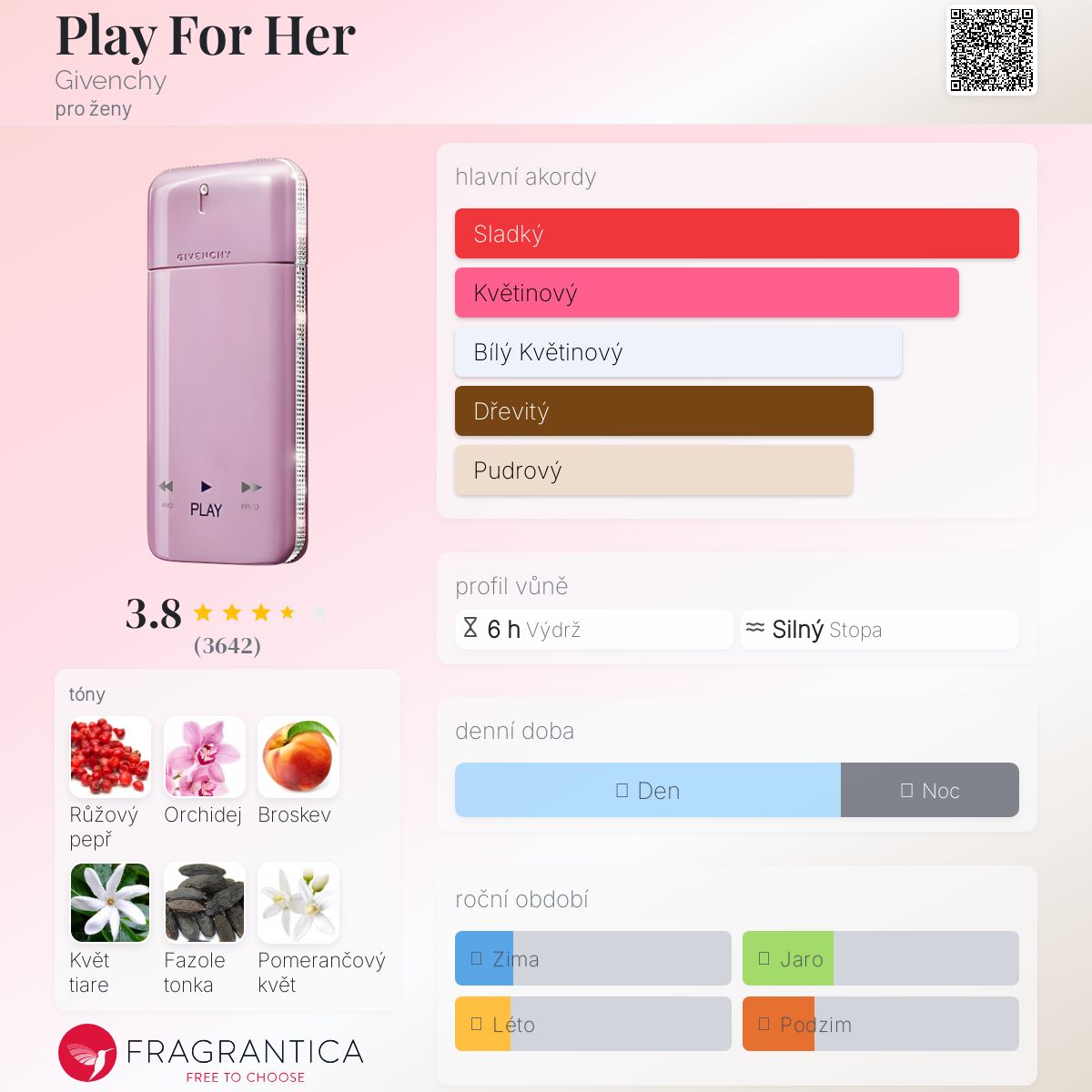 Play For Her podle Givenchy je Orientální Floral vůně pro ženy. Play For Her byl/a uveden/a v roce 2010. Play For Her byl/a vytvořen/a Emilie Coppermann a Lucas Sieuzac. Vrchní tóny jsou Růžový pepř, Broskev, Pomerančový květ, Hrachor a Bergamot; střední tóny jsouOrchidej, Květ tiare, Amyris a Magnólie ; základní tóny jsou Fazole tonka, Santalové dřevo, Pižmo, Pačuli a Benzoin.