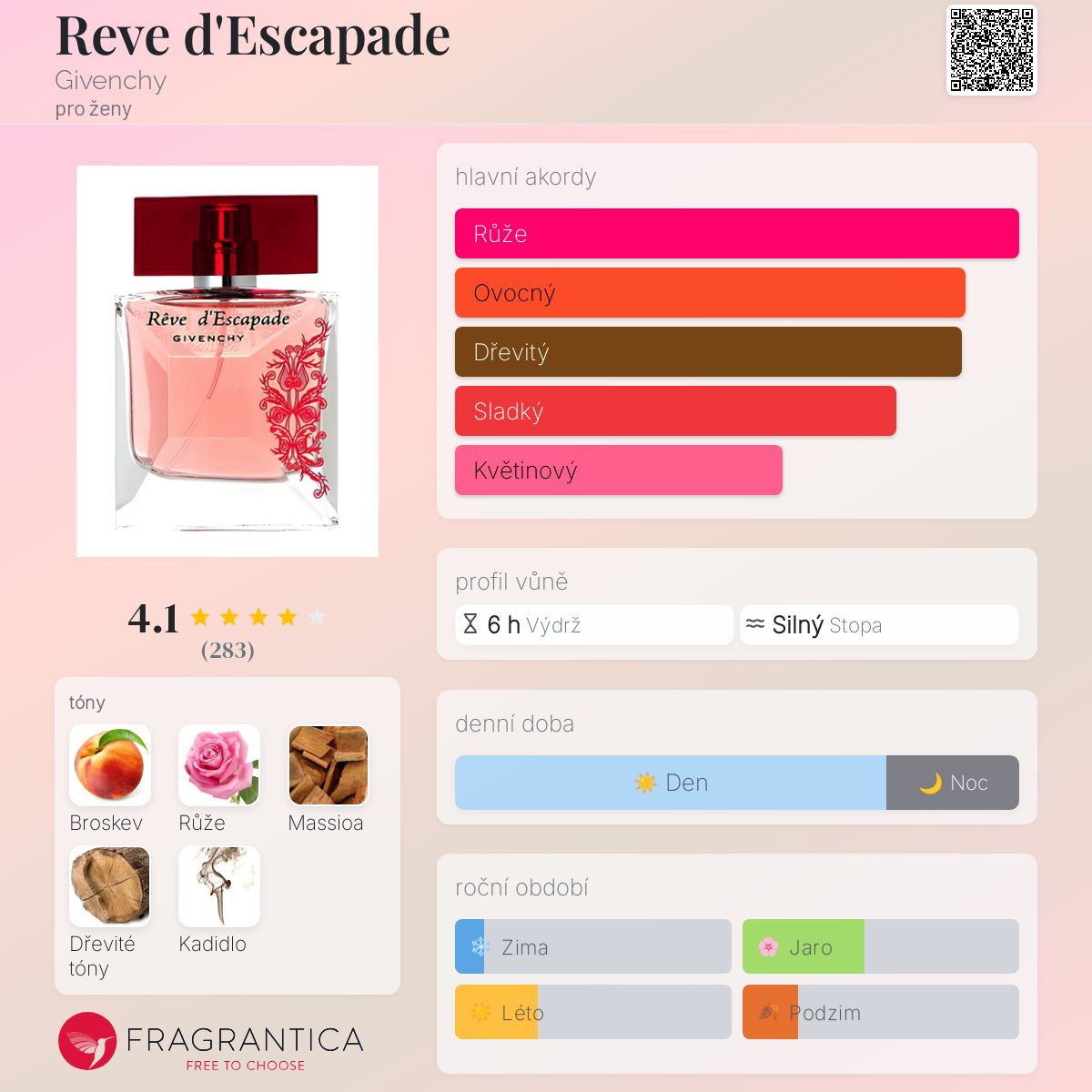 Reve d'Escapade podle Givenchy je Floral vůně pro ženy. Reve d'Escapade byl/a uveden/a v roce 2014. Vrchní tóny jsou Broskev a Dřevo massioa; střední tón jeRůže ; základní tóny jsou Dřevité tóny a Kadidlo.