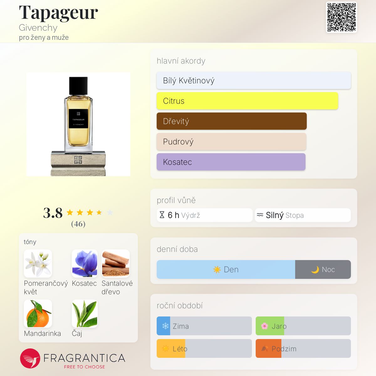 Tapageur podle Givenchy je Woody Floral Musk vůně pro ženy a muže. Toto je nová vůně. Tapageur byl/a uveden/a v roce 2025. Vrchní tón je Zelená mandarinka ; střední tóny jsouPomerančový květ, Kosatec a Černý čaj ; základní tón je Santalové dřevo.