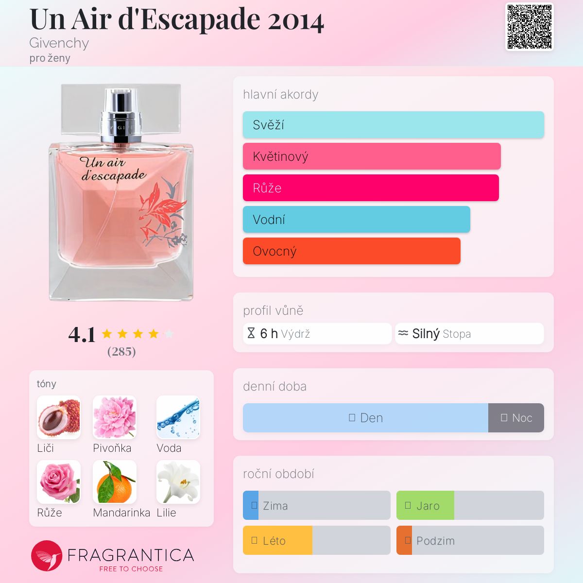 Un Air d'Escapade 2014 podle Givenchy je Floral vůně pro ženy. Un Air d'Escapade 2014 byl/a uveden/a v roce 2012. Vrchní tóny jsou Liči, Vodní tóny a Mandarinka; střední tóny jsouPivoňka, Růže a Lilie ; základní tóny jsou Pižmo a Cedr.