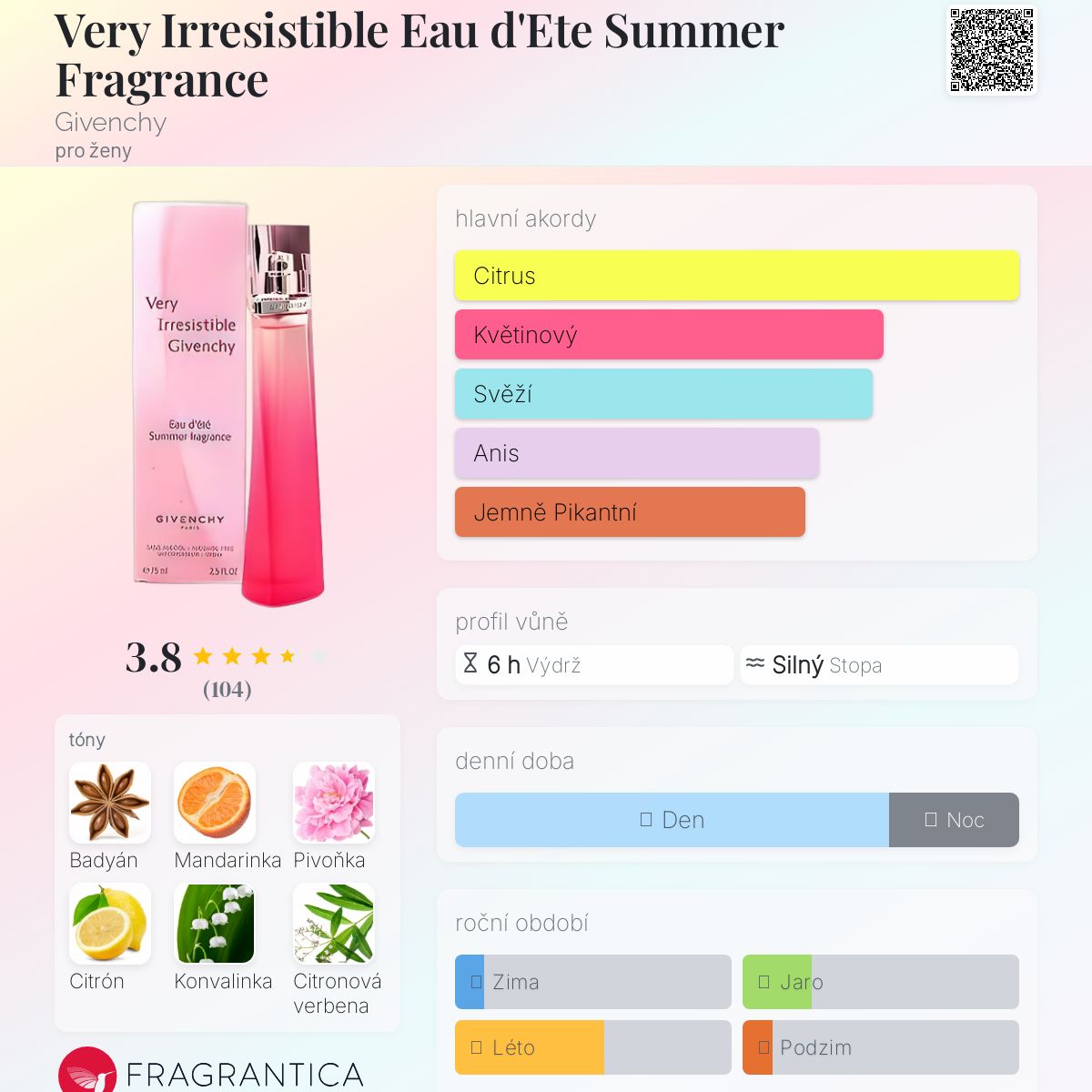 Very Irresistible Eau d'Ete Summer Fragrance podle Givenchy je Floral Fruity vůně pro ženy. Very Irresistible Eau d'Ete Summer Fragrance byl/a uveden/a v roce 2005. Vrchní tóny jsou Badyán a Citrón; střední tóny jsouMandarinka a Konvalinka ; základní tóny jsou Pivoňka a Citronová verbena.