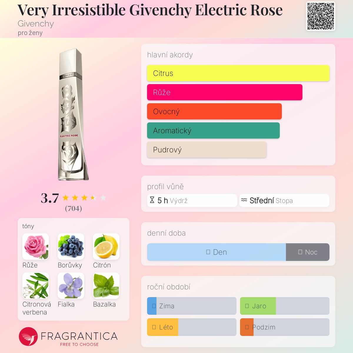Very Irresistible Givenchy Electric Rose podle Givenchy je Floral Green vůně pro ženy. Very Irresistible Givenchy Electric Rose byl/a uveden/a v roce 2012. Vrchní tóny jsou Borůvky, Citrón, Citronová verbena a Bazalka; střední tóny jsouRůže, Fialka a Anýz ; základní tóny jsou Pižmo a Cedr.