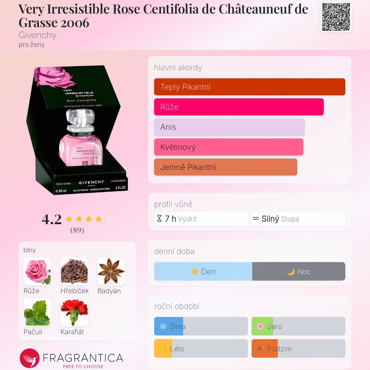 Very Irresistible Rose Centifolia de Châteauneuf de Grasse 2006 podle Givenchy je Floral vůně pro ženy. Very Irresistible Rose Centifolia de Châteauneuf de Grasse 2006 byl/a uveden/a v roce 2006. Vrchní tón je Badyán ; střední tóny jsouRůže, Růže Liv Tyler , Hřebíček a Karafiát ; základní tón je Pačuli.