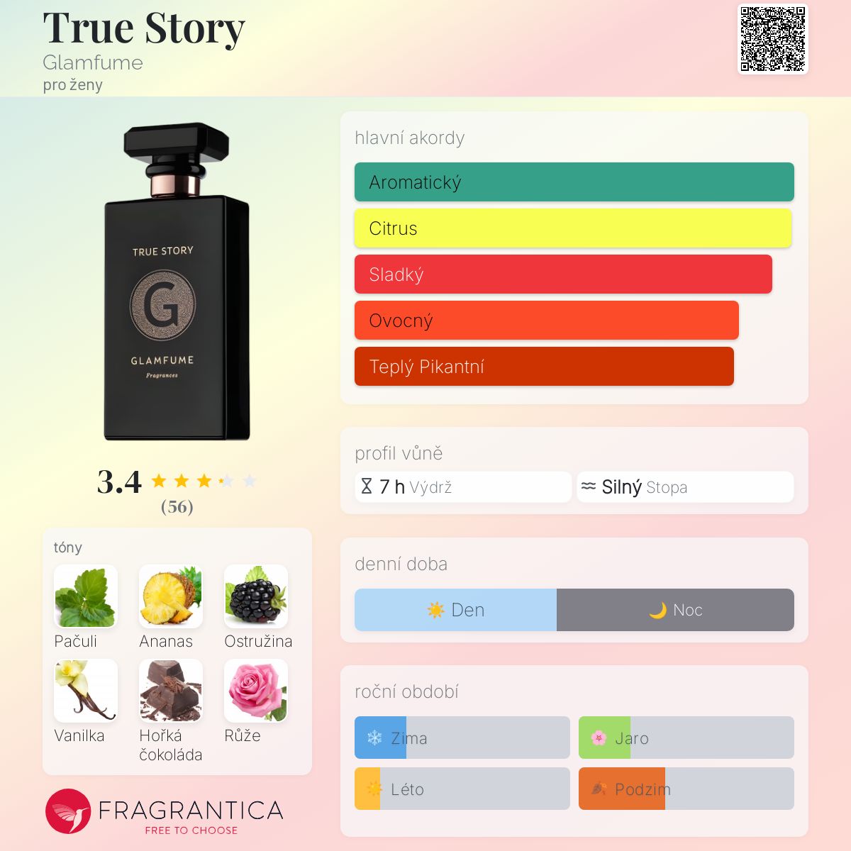 True Story podle Glamfume je Orientální Floral vůně pro ženy. True Story byl/a uveden/a v roce 2016. Vrchní tóny jsou Bergamot, Grapefruit, Muškátový oříšek, Zázvor, Neroli, Mandarinka, Citrón, Petitgrain a Máta; střední tóny jsouAnanas, Ostružina, Růže, Kardamom, Ylang-Ylang, Galbanum, Jasmín, Fialka, Jablko, Tymián, Koriandr, Rozmarýn, Jetel a Pomeranč ; základní tóny jsou Pačuli, Vanilka, Čokoláda, Fazole tonka, Pižmo, Cedr, Jantar (ambra), Dubový mech a Kůže.