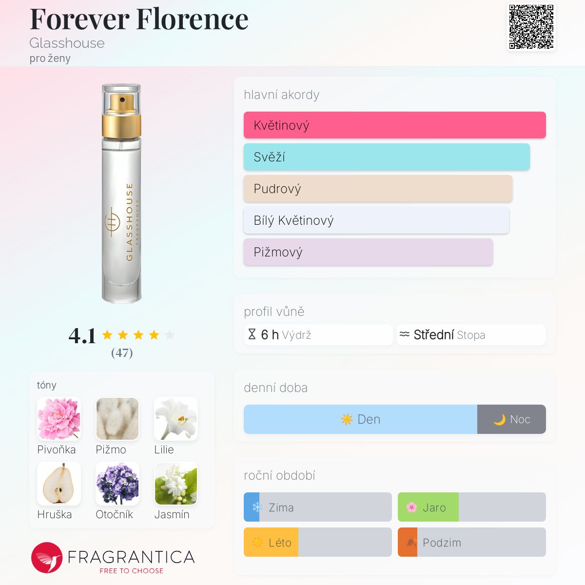 Forever Florence podle Glasshouse je Floral vůně pro ženy. Forever Florence byl/a uveden/a v roce 2019. Vrchní tóny jsou Hruška, Citrusy a Broskev; střední tóny jsouPivoňka, Lilie, Otočník a Jasmín ; základní tóny jsou Pižmo, Santalové dřevo a Jantar (ambra).