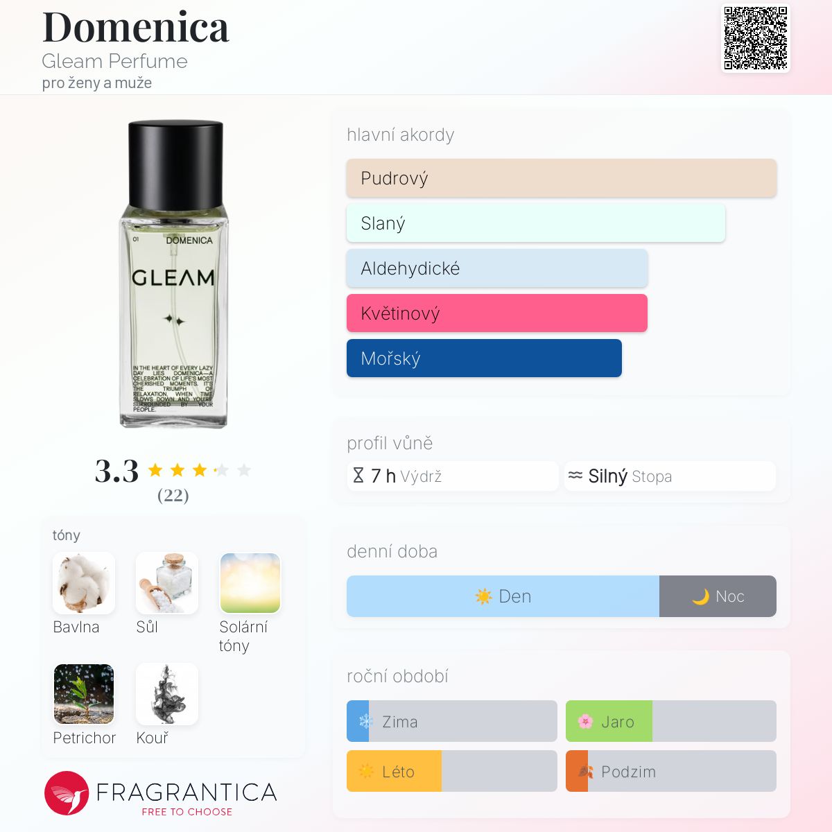 Domenica podle Gleam Perfume je Aromatic vůně pro ženy a muže. Toto je nová vůně. Domenica byl/a uveden/a v roce 2025. Vrchní tón je Sůl ; střední tóny jsouBavlna a Petrichor ; základní tóny jsou Solární tóny a Kouř.