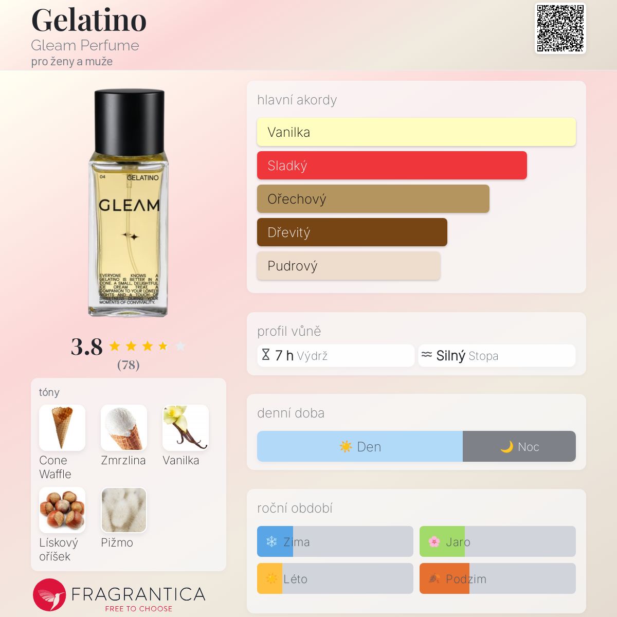 Gelatino podle Gleam Perfume je Citrus Gourmand vůně pro ženy a muže. Toto je nová vůně. Gelatino byl/a uveden/a v roce 2025. Vrchní tón je Kornoutek na zmrzlinu ; střední tóny jsouVanilka a Lískový oříšek ; základní tóny jsou Zmrzlina a Bílé pižmo.