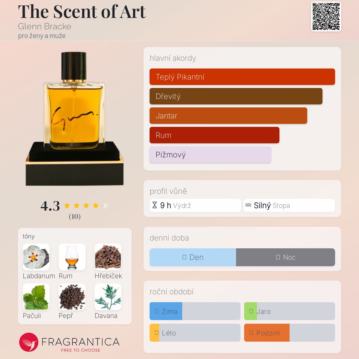 The Scent of Art podle Glenn Bracke je Woody vůně pro ženy a muže. The Scent of Art byl/a uveden/a v roce 2018. "Nosem" za touto vůní je Bertrand Duchaufour. Vrchní tóny jsou Španělské labdanum, Rum, Černý pepř a Davana; střední tóny jsouHřebíček, Med, Guajakové dřevo, Karo Karounde a Karafiát ; základní tóny jsou Labdanum, Pačuli, Agarové dřevo (oud), Kůže a Pižmo.