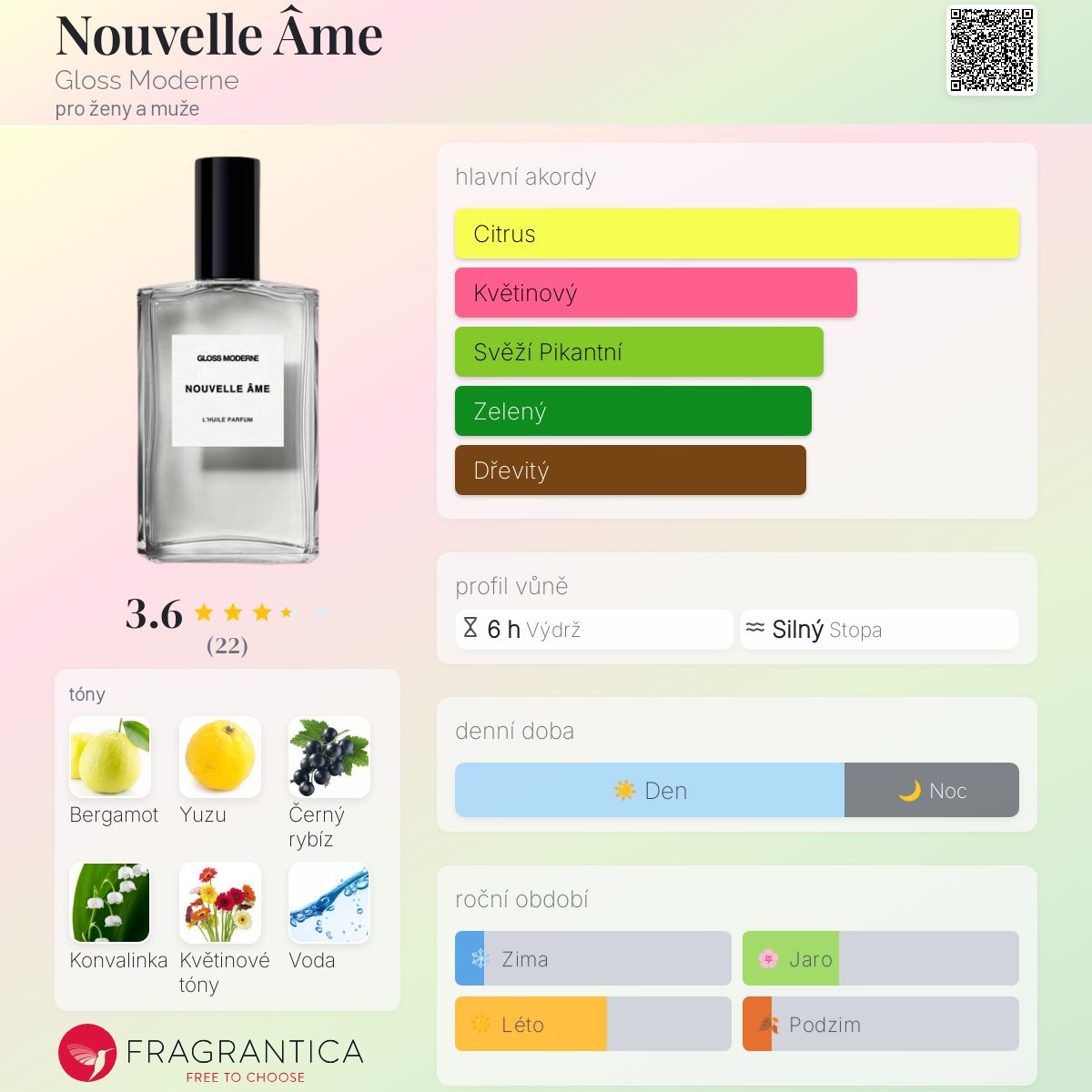 Nouvelle Âme podle Gloss Moderne je Floral Fruity vůně pro ženy a muže. Vrchní tóny jsou Bergamot, Yuzu a Černý rybíz; střední tóny jsouKonvalinka, Květinové tóny a Vodní tóny ; základní tóny jsou Santalové dřevo, Jantar (ambra) a Pižmo.