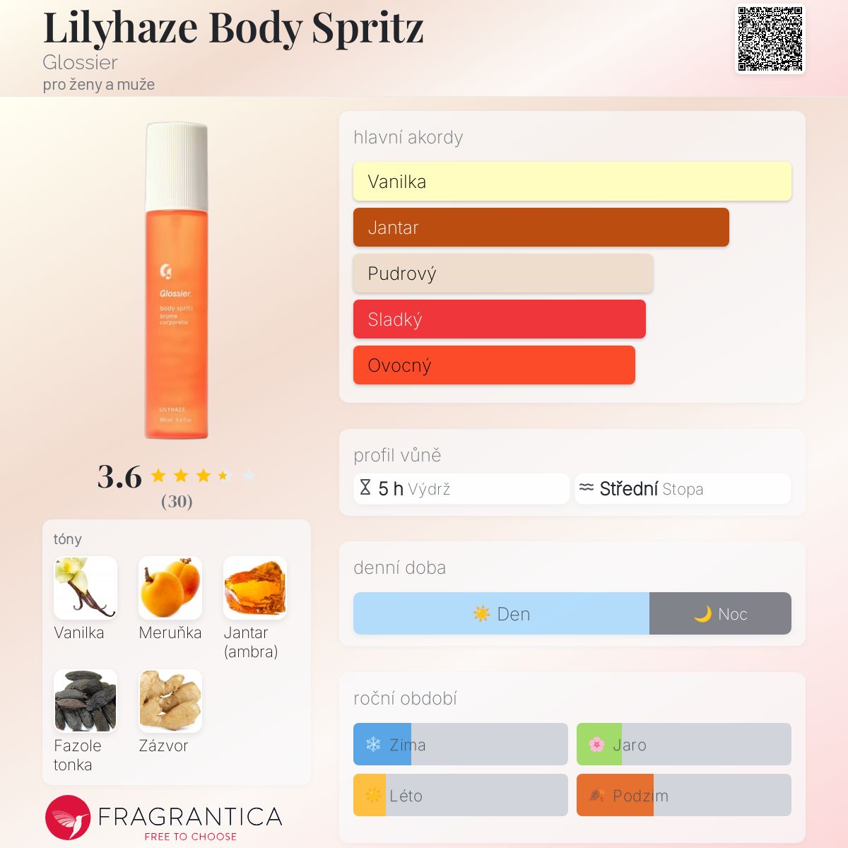 Lilyhaze Body Spritz podle Glossier je Floral vůně pro ženy a muže. Toto je nová vůně. Lilyhaze Body Spritz byl/a uveden/a v roce 2025. Vrchní tóny jsou Meruňka a Zázvor; střední tón jeVanilka ; základní tóny jsou Jantar (ambra) a Fazole tonka.