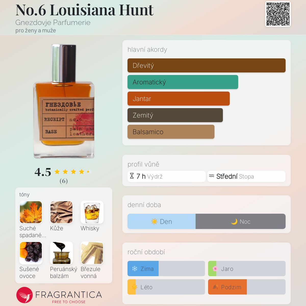 No.6 Louisiana Hunt podle Gnezdovje Parfumerie je Woody Spicy vůně pro ženy a muže. No.6 Louisiana Hunt byl/a uveden/a v roce 2019. "Nosem" za touto vůní je Agata Doronicheva. Vrchní tóny jsou Kůže a Whisky; střední tóny jsouSuché spadané listí, Sušené ovoce, Peruánský balzám, Březule vonná a Tabák ; základní tóny jsou Dřevité tóny, Fazole tonka, Pačuli, Vetiver a Jantar (ambra).