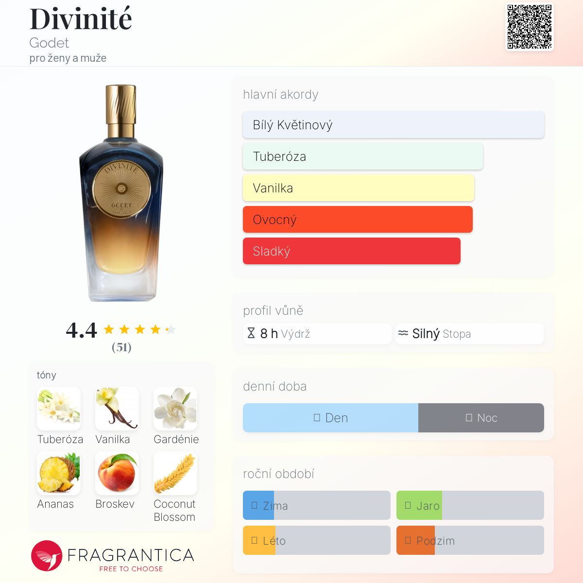 Divinité podle Godet je Floral vůně pro ženy a muže. "Nosem" za touto vůní je Sonia Godet. Vrchní tóny jsou Ananas, Broskev, Kokosový květ a Růže; střední tóny jsouTuberóza a Gardénie ; základní tóny jsou Vanilka a Pačuli.
