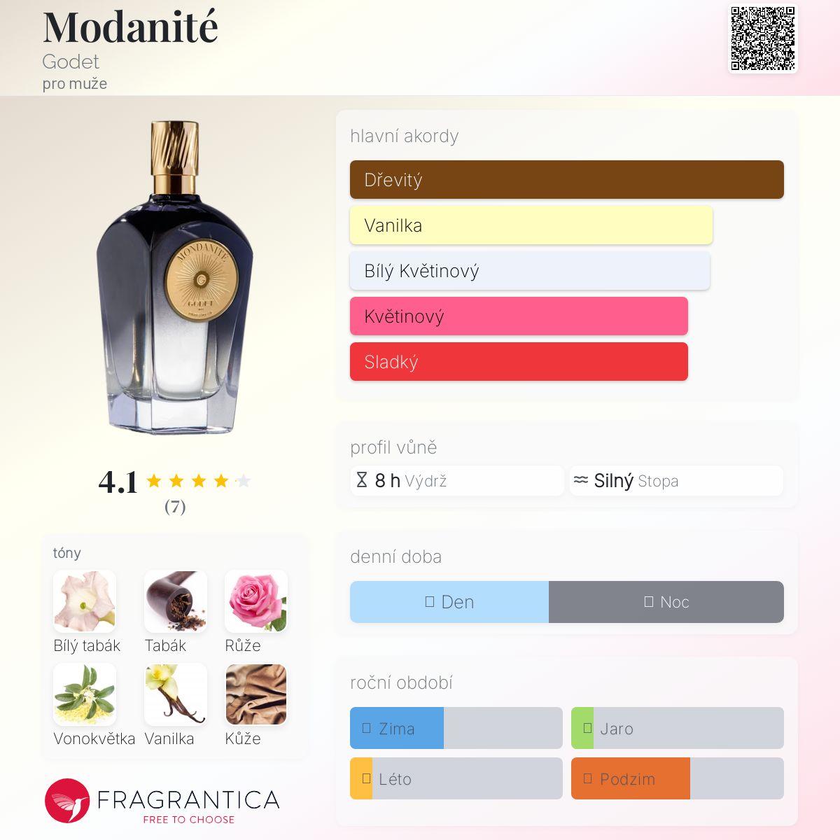 Modanité podle Godet je vůně pro muže. Modanité byl/a uveden/a v roce 2021. Vrchní tóny jsou Bílý tabák, Růže, Růžový pepř a Pačuli; střední tóny jsouTabák, Vonokvětka, Fazole tonka a Kosatec ; základní tóny jsou Vanilka, Kůže, Santalové dřevo a Cedr.