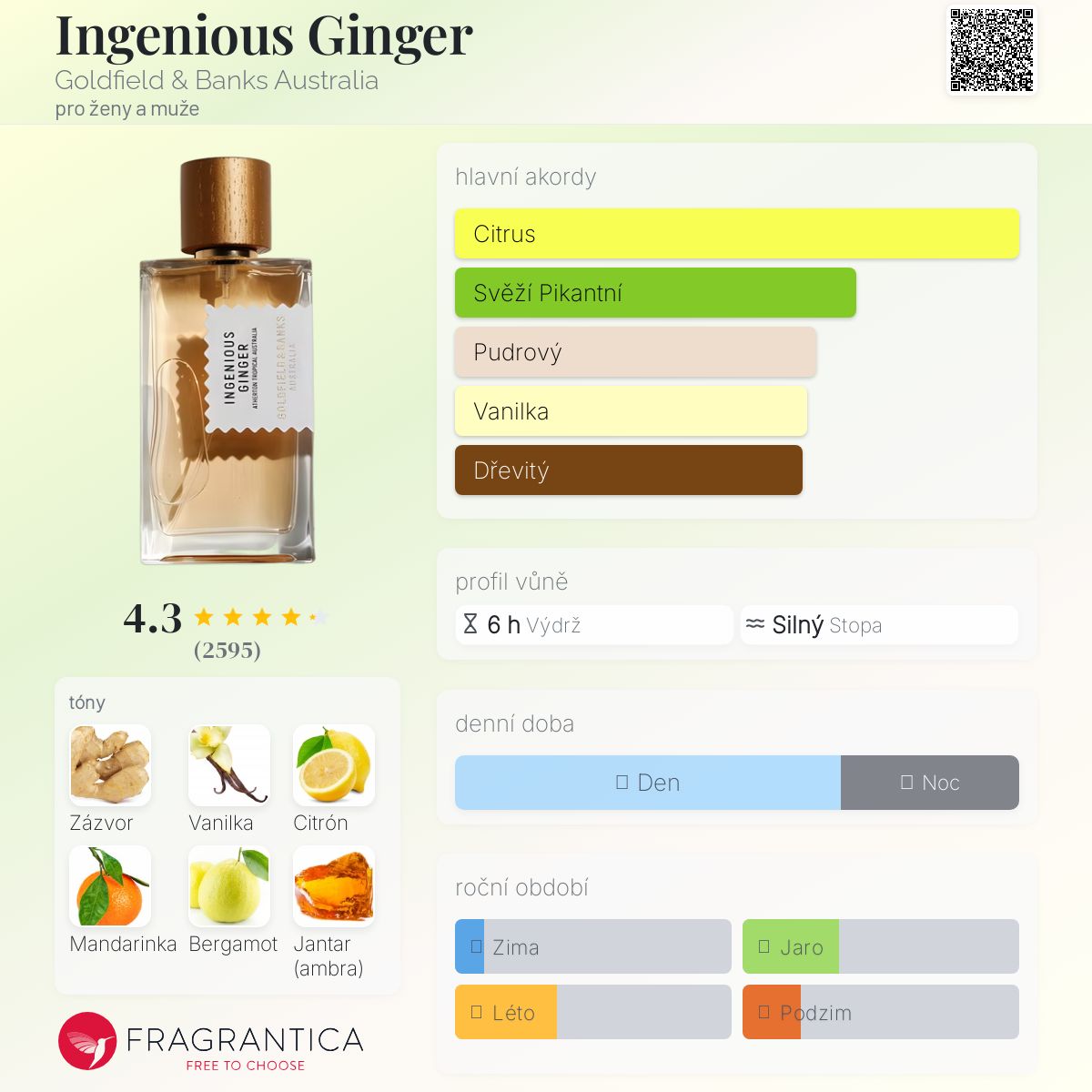 Ingenious Ginger podle Goldfield & Banks Australia je vůně pro ženy a muže. Ingenious Ginger byl/a uveden/a v roce 2023. "Nosem" za touto vůní je Hamid Merati-Kashani. Vrchní tóny jsou Květ zázvoru, Citrón a Bergamot; střední tóny jsouMandarinka, Magnólie, Jasmín a Růže ; základní tóny jsou Vanilka, Jantar (ambra), Santalové dřevo, Kašmír, Pižmo a Pačuli.