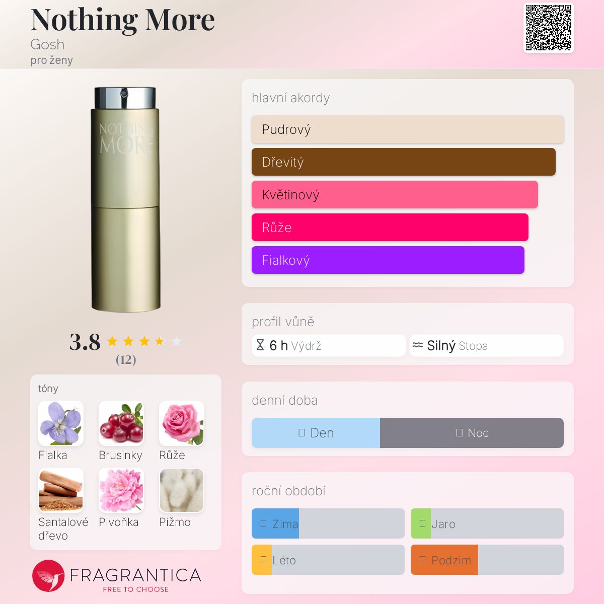 Nothing More podle Gosh je Chypre Fruity vůně pro ženy. Nothing More byla spuštěna během 2000. Vrchní tóny jsou Brusinky a Ostružina; střední tóny jsouFialka, Růže a Pivoňka ; základní tóny jsou Santalové dřevo, Pižmo, Pačuli a Vetiver.
