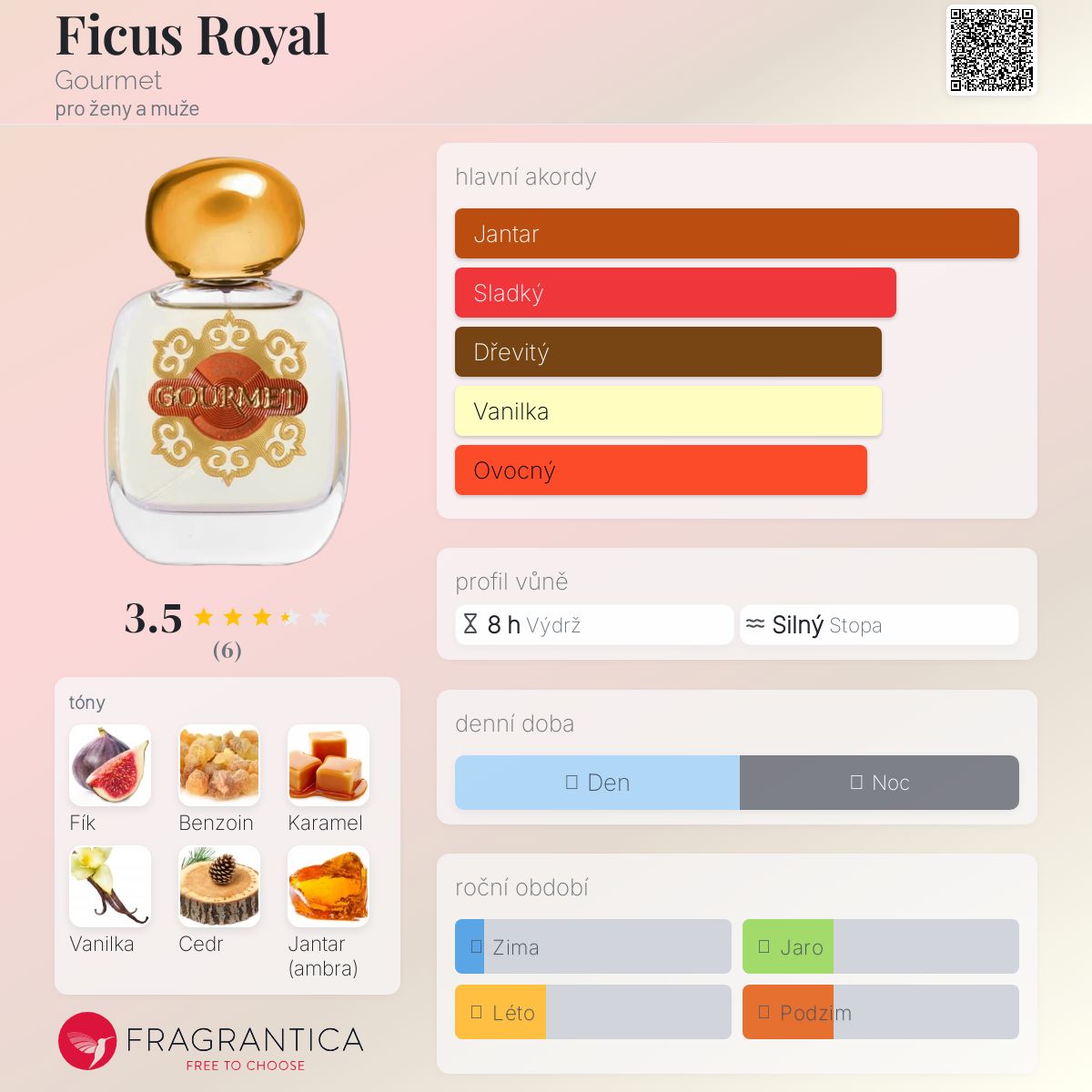 Ficus Royal podle Gourmet je Orientální Vanilla vůně pro ženy a muže. Toto je nová vůně. Ficus Royal byl/a uveden/a v roce 2024. Vrchní tóny jsou Fík a Fíkový list; střední tóny jsouBenzoin, Karamel a Broskvový květ ; základní tóny jsou Vanilka, Cedr, Jantar (ambra) a Pižmo.