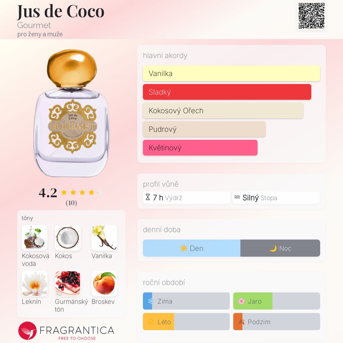 Jus de Coco podle Gourmet je Floral Fruity Gourmand vůně pro ženy a muže. Toto je nová vůně. Jus de Coco byl/a uveden/a v roce 2024. Vrchní tóny jsou Kokosová voda, Kokos, Leknín a Broskev; střední tóny jsouJasmín, Konvalinka a Magnólie ; základní tóny jsou Vanilka, Gurmánský tón a Pižmo.