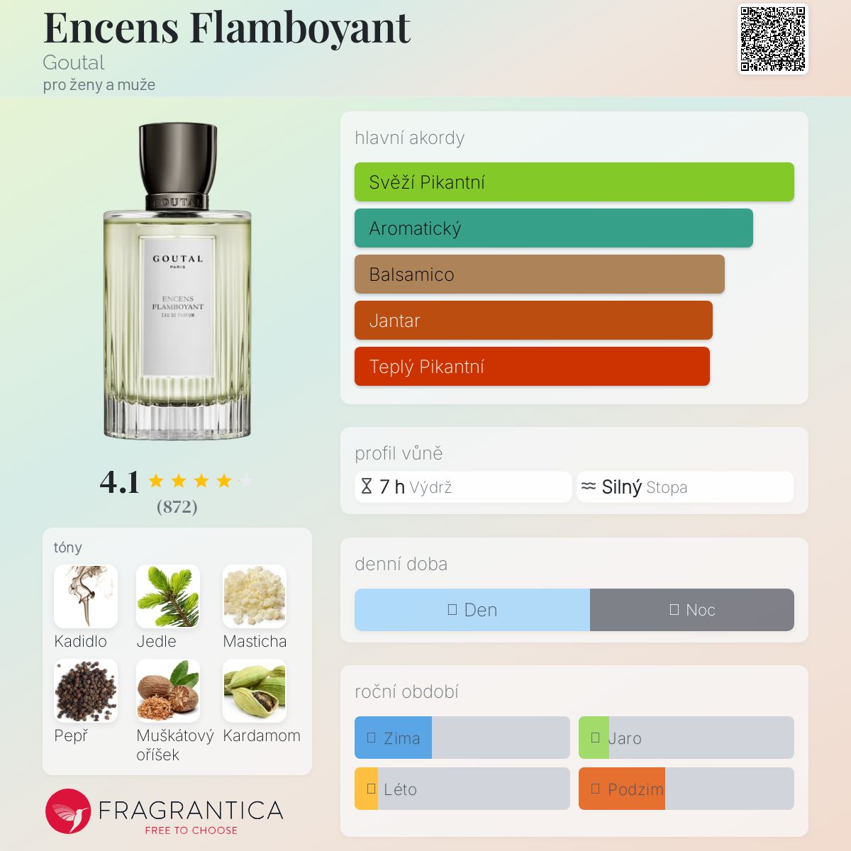 Encens Flamboyant podle Goutal je Orientální vůně pro ženy a muže. Encens Flamboyant byl/a uveden/a v roce 2007. Encens Flamboyant byl/a vytvořen/a Isabelle Doyen a Camille Goutal. Vrchní tóny jsou Kadidlo, Pepř, Růžový pepř a Červené bobule; střední tóny jsouKadidlo, Muškátový oříšek, Kardamom a Šalvěj ; základní tóny jsou Kadidlo, Jedle balzámová a Masticha.
