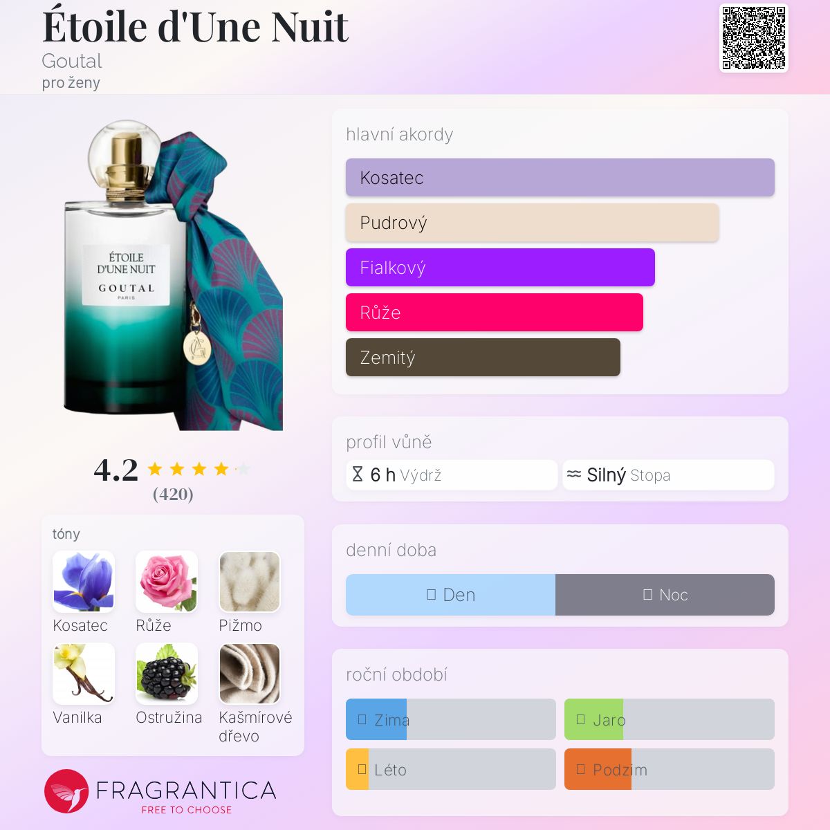Étoile d'Une Nuit podle Goutal je Floral Fruity vůně pro ženy. Étoile d'Une Nuit byl/a uveden/a v roce 2019. "Nosem" za touto vůní je Mathieu Nardin. Vrchní tóny jsou Ostružina, Bergamot a Italská mandarinka; střední tóny jsouKosatec, Růže a Egyptský jasmín ; základní tóny jsou Pižmo, Vanilka a Kašmírové dřevo.