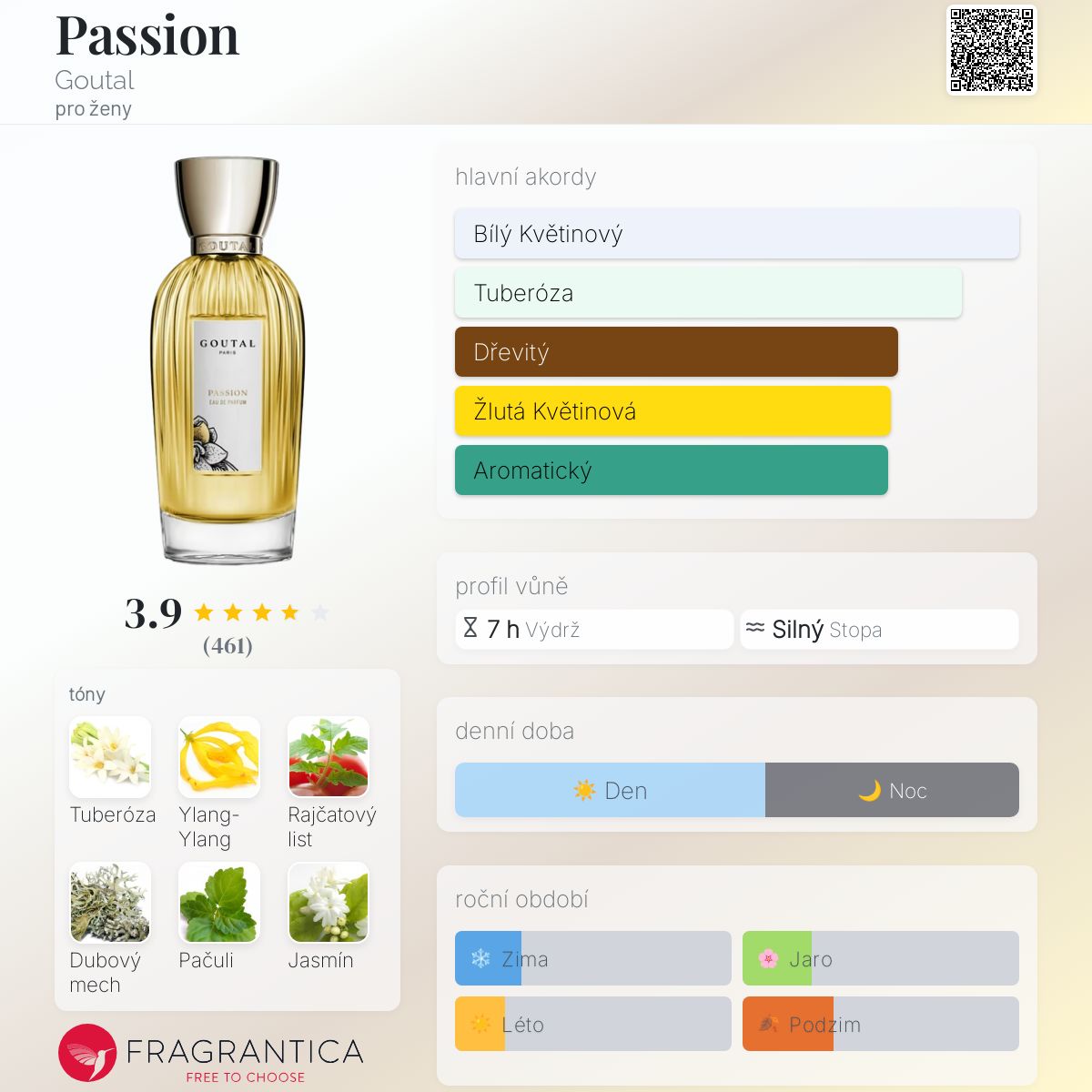 Passion podle Goutal je Floral vůně pro ženy. Passion byl/a uveden/a v roce 1983. "Nosem" za touto vůní je Annick Goutal. Vrchní tóny jsou Tuberóza a Rajčatový list; střední tóny jsouYlang-Ylang, Jasmín a Vanilka ; základní tóny jsou Dubový mech a Pačuli.