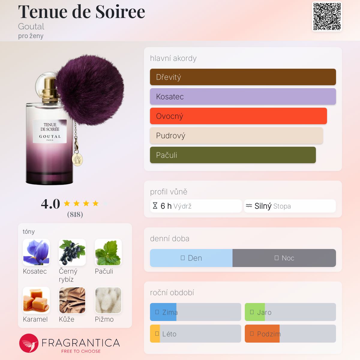 Tenue de Soiree podle Goutal je Chypre vůně pro ženy. Tenue de Soiree byl/a uveden/a v roce 2016. "Nosem" za touto vůní je Mathieu Nardin. Vrchní tóny jsou Černý rybíz a Bergamot; střední tóny jsouKosatec, Růže a Jasmín ; základní tóny jsou Pačuli, Karamel, Kůže a Bílé pižmo.