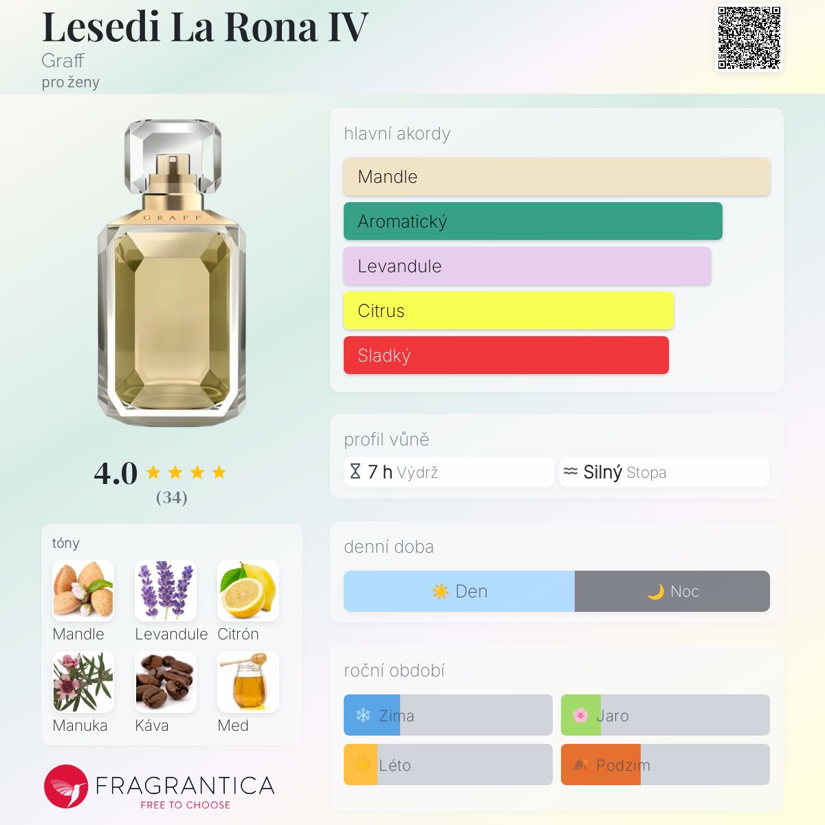 Lesedi La Rona IV podle Graff je Orientální Vanilla vůně pro ženy. Lesedi La Rona IV byl/a uveden/a v roce 2020. "Nosem" za touto vůní je Stephen Nilsen. Vrchní tóny jsou Levandule, Italský citrón a Bílá růže; střední tóny jsouManuka, Med a Fazole tonka ; základní tóny jsou Sladká mandle a Káva.