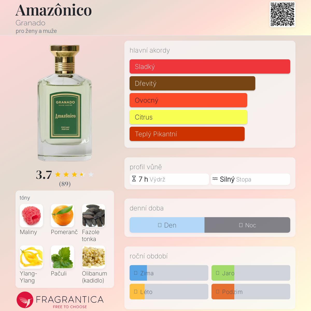 Amazônico podle Granado je Floral Woody Musk vůně pro ženy a muže. Toto je nová vůně. Amazônico byl/a uveden/a v roce 2025. "Nosem" za touto vůní je Ilias Ermenidis. Vrchní tóny jsou Maliny, Pomeranč a Olibanum; střední tóny jsouYlang-Ylang, Maté a Kakao ; základní tóny jsou Fazole tonka, Pačuli a Santalové dřevo.