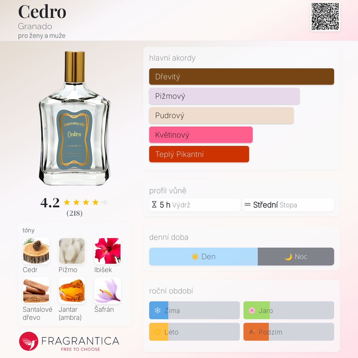 Cedro podle Granado je Orientální Woody vůně pro ženy a muže. Cedro byl/a uveden/a v roce 2019. Vrchní tóny jsou Pižmo, Ibišek a Semeno ibišku; střední tóny jsouCedr, Kašmírové pižmo a Šafrán ; základní tóny jsou Cedr, Santalové dřevo a Jantar (ambra).