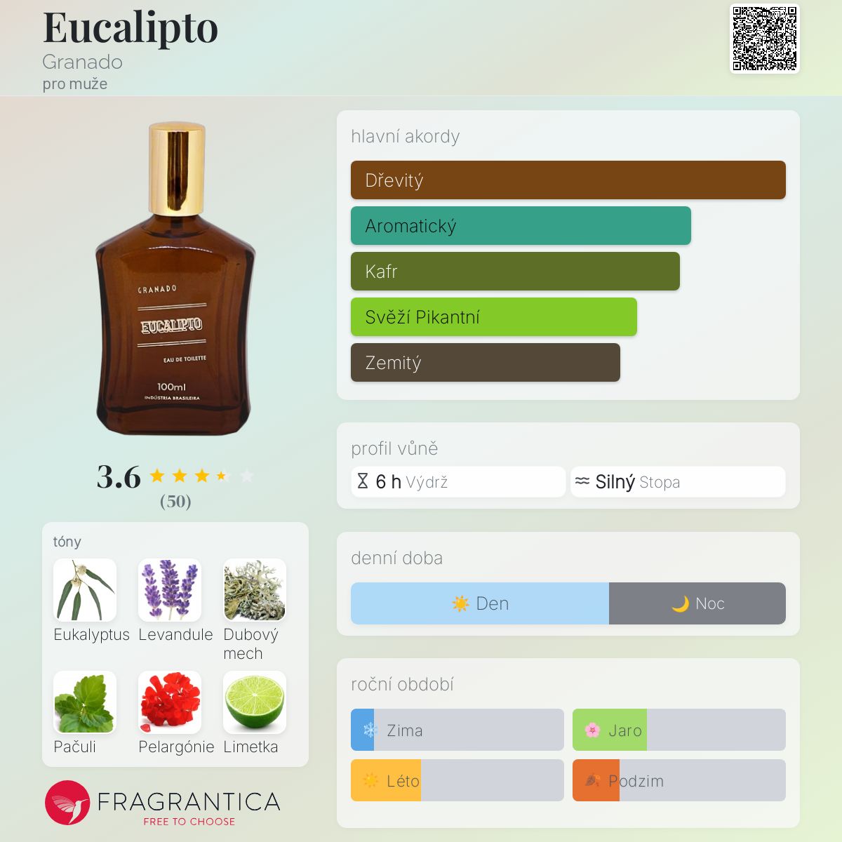 Eucalipto podle Granado je Woody Aromatic vůně pro muže. Eucalipto byl/a uveden/a v roce 2018. Vrchní tóny jsou Eukalyptus, Limetka a Bergamot; střední tóny jsouLevandule, Pelargónie a Jasmín ; základní tóny jsou Mech, Pačuli a Jantar (ambra).