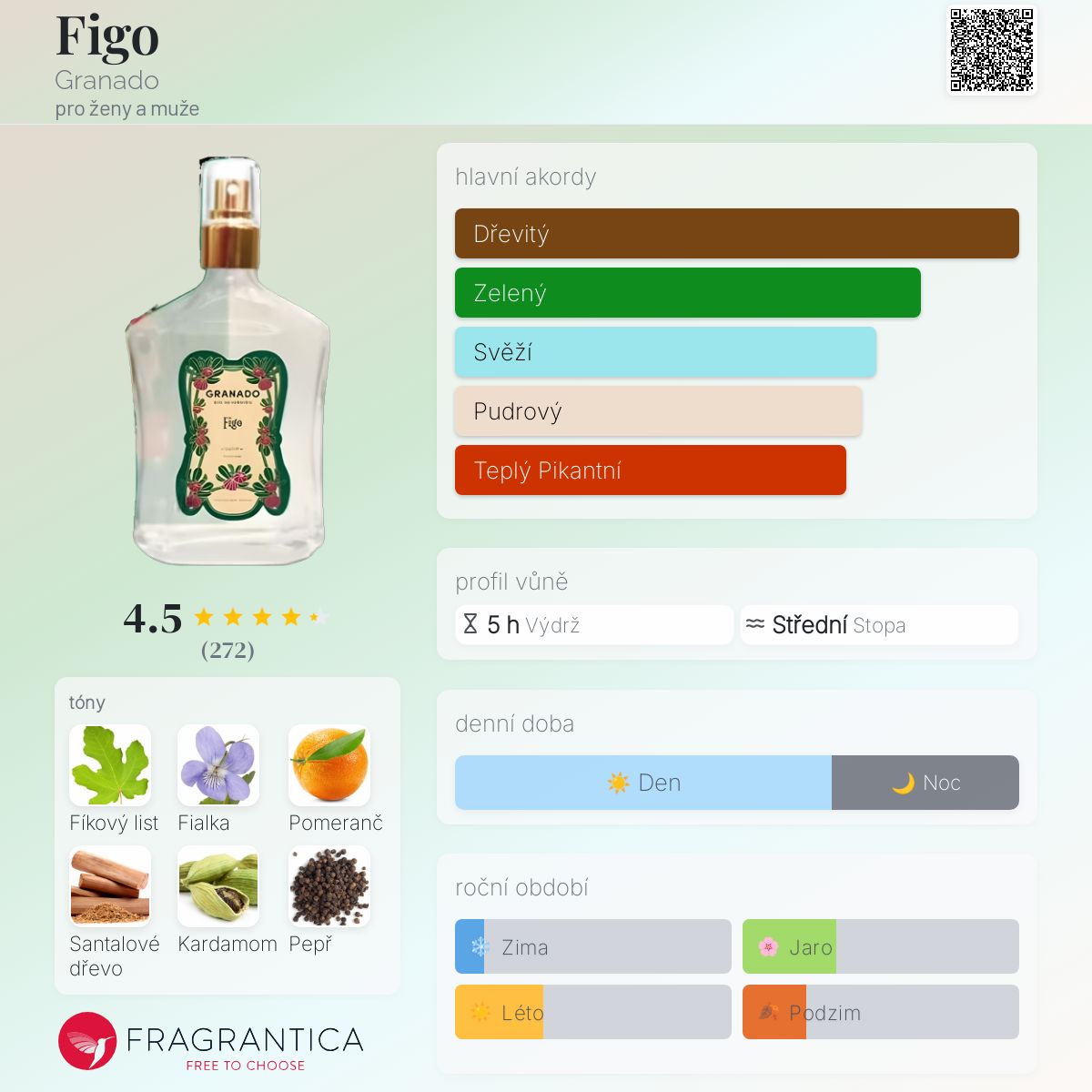 Figo podle Granado je Woody Aromatic vůně pro ženy a muže. Figo byl/a uveden/a v roce 2023. "Nosem" za touto vůní je Florian Gallo. Vrchní tóny jsou Pomeranč, Kardamom a Černý pepř; střední tóny jsouFíkový list, Fialka a Cedr ; základní tóny jsou Santalové dřevo, Guajakové dřevo a Jantar (ambra).