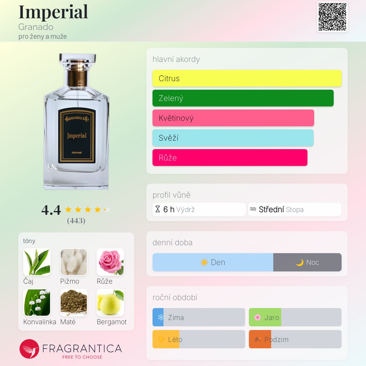 Imperial podle Granado je Floral Woody Musk vůně pro ženy a muže. Imperial byl/a uveden/a v roce 2020. "Nosem" za touto vůní je Guillaume Flavigny. Vrchní tóny jsou Bílý čaj, Bergamot a Mandarinka; střední tóny jsouRůže, Konvalinka a Magnólie ; základní tóny jsou Pižmo, Maté a Santalové dřevo.