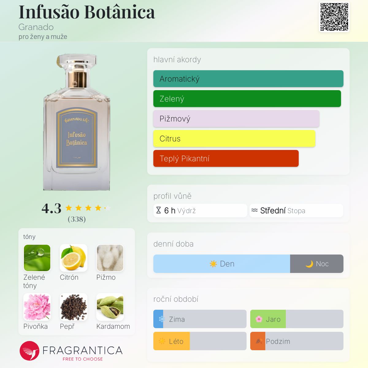 Infusão Botânica podle Granado je Woody Spicy vůně pro ženy a muže. Infusão Botânica byl/a uveden/a v roce 2022. "Nosem" za touto vůní je Ralf Schwieger. Vrchní tóny jsou Citrón, Černý pepř a Koriandr; střední tóny jsouZelené tóny, Pivoňka a Kardamom ; základní tóny jsou Pižmo, Kašmír a Vetiver.