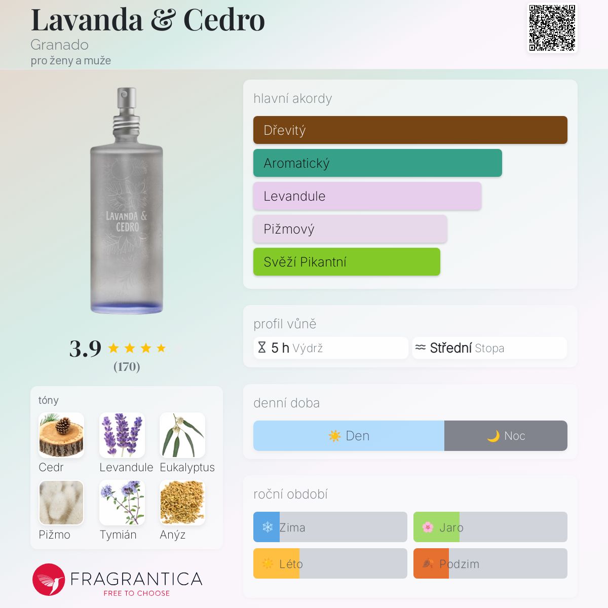 Lavanda & Cedro podle Granado je Woody Aromatic vůně pro ženy a muže. Lavanda & Cedro byl/a uveden/a v roce 2020. Vrchní tóny jsou Eukalyptus, Anýz a Fík; střední tóny jsouLevandule, Divoká levandule a Tymián ; základní tóny jsou Cedr, Pižmo a Dřevo cypřišku tupolistého.