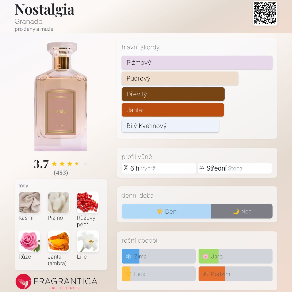 Nostalgia podle Granado je Floral Woody Musk vůně pro ženy a muže. Nostalgia byl/a uveden/a v roce 2022. "Nosem" za touto vůní je Jasmine Liu. Vrchní tóny jsou Růžový pepř, Mandarinka a Bergamot; střední tóny jsouRůže, Lilie a Pomerančový květ ; základní tóny jsou Kašmír, Pižmo a Jantar (ambra).