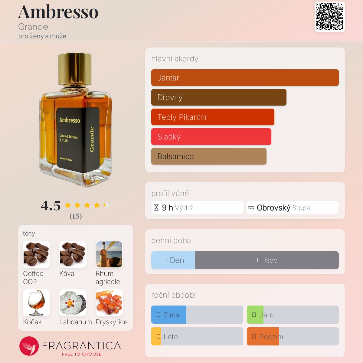 Ambresso podle Grande je vůně pro ženy a muže. Ambresso byl/a uveden/a v roce 2024. "Nosem" za touto vůní je Marius Pana. Vrchní tóny jsou Káva CO2, Nové koření a Myrha; střední tóny jsouKáva, Rhum agricole, Koňak, Tabák, Včelí vosk, Rozinka, Myrta, Růže, Muškátový oříšek, Konvalinka a Cedr ; základní tóny jsou Labdanum, Pryskyřice, Siamský (thajský) benzoin, Jantar (ambra), Kastoreum, Madagaskarská vanilka, Balzám Tolu, Peruánský balzám, Pačuli, Guajakové dřevo, Fazole tonka, Ambra, Opoponax, Australské santalové dřevo a Pižmo.