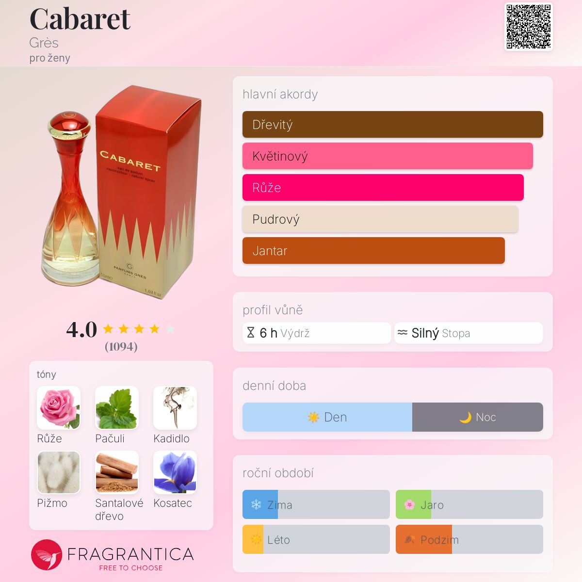 Cabaret podle Grès je Chypre Floral vůně pro ženy. Cabaret byl/a uveden/a v roce 2002. "Nosem" za touto vůní je Michel Almairac. Vrchní tóny jsou Růže, Pivoňka a Konvalinka; střední tóny jsouKadidlo, Kosatec a Fialka ; základní tóny jsou Pačuli, Pižmo, Santalové dřevo, Nerium Oleander a Jantar (ambra).