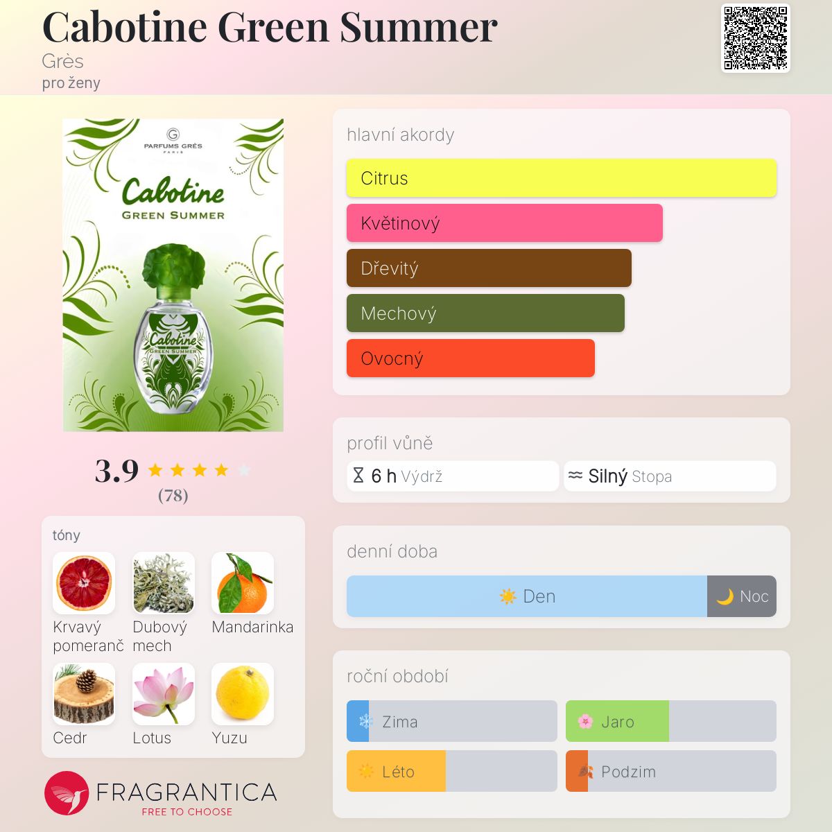 Cabotine Green Summer podle Grès je vůně pro ženy. Cabotine Green Summer byl/a uveden/a v roce 2010. "Nosem" za touto vůní je Marie Salamagne. Vrchní tóny jsou Krvavý pomeranč, Mandarinka, Yuzu a Hruška; střední tóny jsouLotus, Frézie a Jasmín ; základní tóny jsou Dubový mech, Cedr a Pižmo.